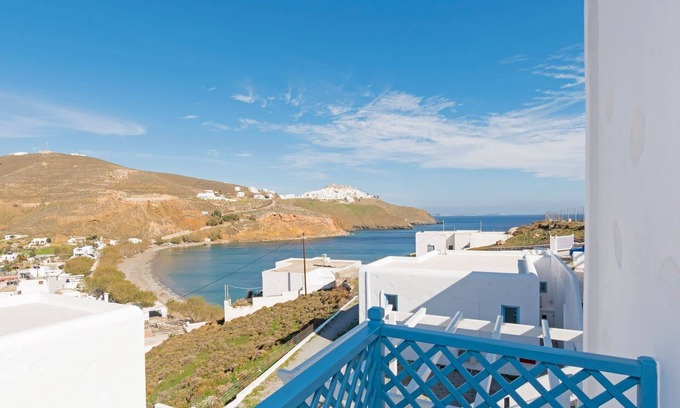 Both upper-floor bedrooms grant access to a sprawling terrace, inviting guests to indulge in the breath-taking views of the Aegean Sea, the Venetian castle, and the picturesque Livadi beach. One of the rooms extends its charm further through a small balcony, showcasing the island's characteristic wooden-panelled railing and a blue traditional balcony door.