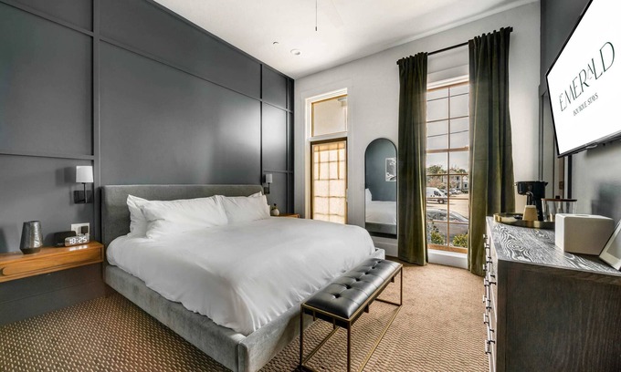 Well appointed hotel room in the Emerald Boutique Stays hotel located in the historic point neighborhood