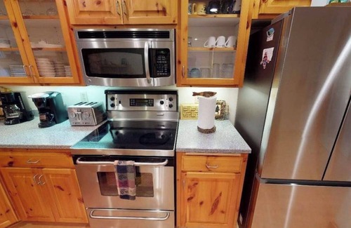 Enjoy the large, well-appointed full kitchen with its massive island, corian countertops and new(er) stainless steel appliances. Relax in the cozy recliners around the living room stone fireplace, watching the lake. Listen to the waves from the wonderful master bedroom ensuite, with its gas fireplace, large jacuzzi tub, private bathroom and deck. The charming second bedroom offers 2 twin beds, with another full bathroom across the hall. The main level den, with sliding glass doors, provides another private space for work and a sleep sofa. A third bathroom (half) is next to the den. The quiet setting provides a great work-from-home option, with strong fiber Wifi. Streaming TV options and 150+ DVD movies are offered, washer & dryer are next to the bedrooms, and the attached one-car garage provides additional convenience and space!