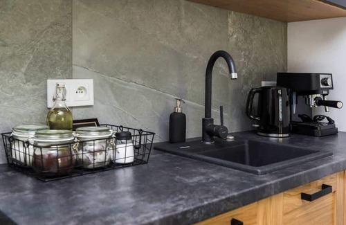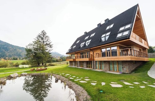 Relax in a comfortable apartment in a green mountain enclave with a view of Giewont, located right next to the Tatra National Park. We offer our guests a space that combines the Podhale tradition with modernity. Here, you will find an outdoor relaxation area, a children's playground, and water ponds that create a charming atmosphere.
