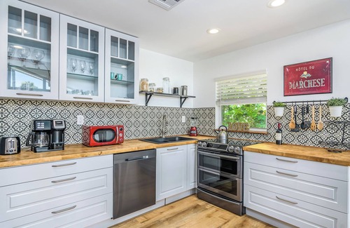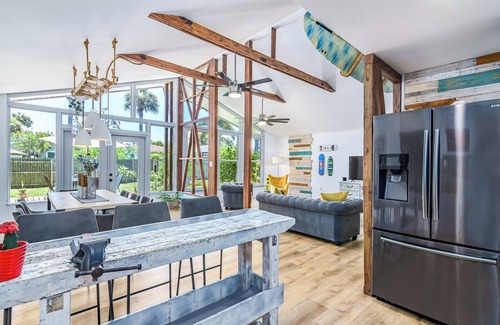 Unique mid-century modern home combines tastefully colorful, European industrial aesthetics with carefully chosen decor on trend with a rad nod to the surf and skate culture that Cocoa Beach is famous for. LOCATION LOCATION LOCATION!!! The street is directly across from Lori Wilson Park -- a public beach boasting great views of rockets launching weekly. The gateway to Downtown Cocoa Beach is less than a mile away where restaurants, watering holes, art galleries, and shopping local businesses abide.