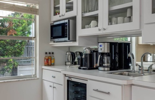 The fully equipped kitchen includes everything you need for preparing meals, including all dinnerware, pots and pans, blender, mixer, glassware, wine cooler and more. Much thought went into the kitchen to ensure every last detail was provided to meet your every desire or need. All the items are new and no expense was held when filling every cabinet and drawer. You will be delighted to wake up to the smell of coffee from high end coffee machine and separate grinder. If you want to make a special latte, use the Nespresso machine and included pods and milk frother to curate that handcrafted touch. Add a touch of flavor using one of the included Starbucks bottled flavors provided.
