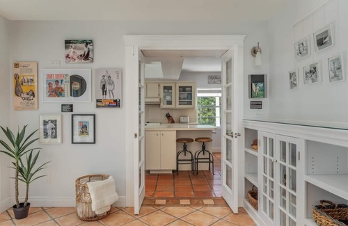 The “Gidget” room is an indoor patio area perfect for lounging and watching the pool. Laze away on the West Elm rattan chairs while kicking up on the ottomans nearby. The historical facts surrounding the real person behind the Gidget surfing movie sets the theme while being immersed in a fun 60s retro atmosphere where you can even turn a vinyl on the nearby record player to set the mood. All this in a cottage style room with relaxing whites and grays adorning the ornate woodwork. The fireplace completes the ambience and atmosphere of this soon to be your favorite room.