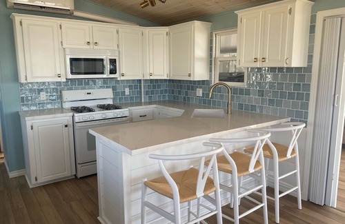 This newly renovated open concept lakefront cottage is located in the quiet neighborhood of Surfside. Located right at the end of no through street here you will find peace and tranquility listening to the waves of Lake Erie. Panoramic views from multiple windows inside this cottage will not disappoint! It is only a 2 minute golf cart ride to ELCO beach. At the end of the street is the big Shipwreck park for the kids. no This is a 1 bedroom cottage plus bunk bed area that sleeps 6 . The add a room has a divider to allow for privacy with a queen pullout. The den also has 1 queen pull out. Cottage is very spacious with the open concept feel.