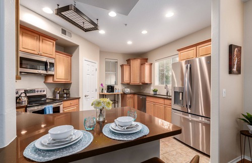 Amazing 2 bedroom condo in a great area of Surprise. 30 night minimum. The coveted ground floor everyone is looking for. This home away from home lives large and has a two car garage to boot. Step inside through the garage or private courtyard and you will instantly be welcomed by the contemporary decor and open concept living room, dining room and kitchen. Reclining furniture throughout the living room just in front of the cozy fireplace and TV. Dine in style on the dining room table and chairs for 4 or site up to the breakfast bar for a quick cup of java or to chat during meal prep. The kitchen is spacious with lots of counter space, cabinets and a standalone coffee bar. It has absolutely everything and more than you will need to cook, bake or prepare a BBQ meal. Down the hall you will find the master bedroom with a king sized bed, private courtyard, large tv and spa like bath with a walk in shower, double sinks and a walk in closet. Bedroom 2 has a queen size Murphy bed, that can be put up for extra space in the 2nd use for the space and office with 2 separate workspaces. This bedroom also has a large hall bath with tub and shower combo. There is a full sized laundry room, 2 car tandem garage and superfast Wi-Fi.