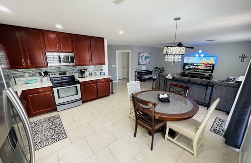 - Kitchen Features Refrigerator with Ice Maker, Dishwasher, Microwave, Electric Stove/Oven, Coffee Machine, Blender, Mini-oven and 4 Seat Dining Table.