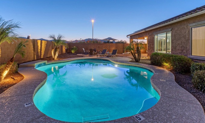 Welcome to TEQUILA SUNSET, our 3,081 sq ft, 4 BR, 2.5 BA, one story home in Surprise, AZ! The backyard offers a peaceful setting with a pool with optional heat and the most amazing views of the White Tank Mountains. The pool heating fee is $75.00 per night to heat the pool to 80º F. Plan romantic interludes with your significant other in the hot tub. The gas grill will please the outdoor chef; a wood burning fire pit will warm you on chilly evenings when no burn restrictions are in place. Wood can be purchased at local grocery stores. You won't want to miss our famous and brilliant sunsets from the amazing backyard oasis!