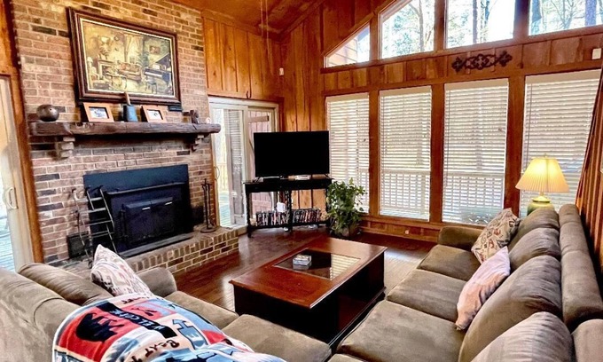 You will be greeted by nature when you arrive. The cabin is surrounded by woods on all sides so there's plenty of wildlife to enjoy. Upon entering the property, you will arrive in the family room. It has tons of windows and natural light. It allows you to still enjoy the beauty of nature but from the comfort of a huge LazyBoy sectional. The highlight of the home may be the amazing wood burning fireplace. It's perfect for that romantic evening you've been dreaming of.