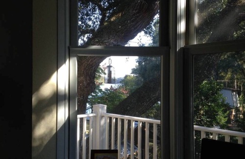 One of a kind custom home, in old Florida style with complete veranda, high ceilings, granite countertops, wood floors / tile, and the biggest two person shower you've ever seen! Nestled among the treetops on beautifully landscaped property, the main floor sits 15 feet above ground level where the birds will entertain you and you will be inspired by the glistening river below. Relax in sleep number queen bed in master bedroom with a movie on the flat screen TV or enjoy the gorgeous river view from the private recliner sofa. Join your group in the living room for a movie on the HD television, while warming your toes by the gas fireplace. Gourmet chef's kitchen gives ample space for preparing and entertaining. Dine outside on the main floor veranda or indoors at antique french country table, which adjusts to seat 6-10. The other two bedrooms feature queen sized beds, antique furniture and palm ceiling fans.