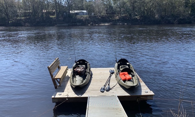 UPDATE- our house is standing but wehave no utilities at this time. Will update listing when we do. Good news is the river view from the house is much better now! 😅 Welcome to our home on 2 acres along the Suwannee River. We hope you enjoy it as much as we do. The seclusion and quietness will draw you in and make the hustle and bustle of a busy world just disappear (if only for the weekend). Look out for the wildlife here. Lots of deer, turkeys, owls, coyotes and even a bobcat! So if you have small pets please don’t leave them unattended outside, but sit on the porch quietly enjoy the river view and listen to what nature has to offer. Also welcome to rural Florida. While we do provide once a month pest control you may still occasionally find a bug or web in the house. So be sure to bring your bug spray for outdoor activities as the mosquitos can get crazy in summer months. We have recently added two tandem kayaks to the property which can be enjoyed by guests for a refundable deposit. Not responsible for injury related to kayak use. Please contact host for more info. Failure to pay identify pets are staying before arrival will result in a $200 fee or cancellation of your reservation without refund. We do monitor cameras at arrival and departure for this reason. PLEASE READ OUR ENTIRE RENTAL ACKNOWLEDGEMENT BEFORE BOOKING FOR MORE INFORMATION AND RULES.