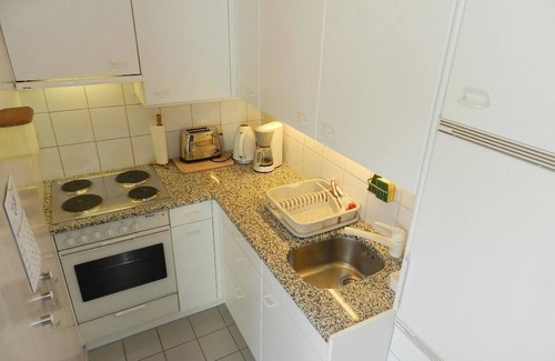2 room apartment (32sqm). Living room with sofa which converts into a conventional bed (for 1 person), kitchenette (among other things furnished with ceramic hob, oven, refrigerator with deep-freezer compartment, filter coffee machine as well as a fondue-set) and dining corner, radio, TV, telephone, WiFi. 1 bedroom with double bed (90x190cm). Bathroom with shower/toilet. Wardrobe. Balcony with table and chairs, 2 deck chairs. Baby cot (60x120cm) incl. bed linen available.