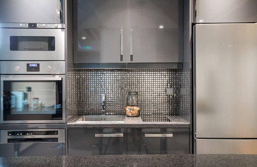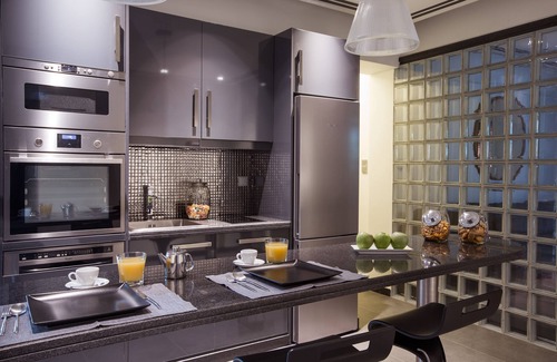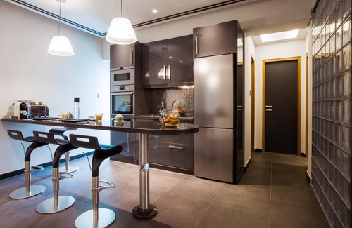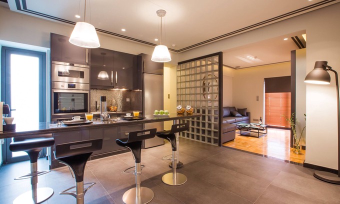 The core of the apartment is the modern and spacious kitchen area which is designed as an open space that features a modern granite table standing on a glass and granite base, where the guests can dine or prepare their meals. It is fully-equipped and organized for cooking and dining entertainment with all the necessary cooking appliances, kitchenware, dinnerware, cutlery etc. The electric appliances are: a Nespresso coffee machine, a kettle, a toaster, a dishwasher, a glass ceramic hob, a microwave oven and an oven.