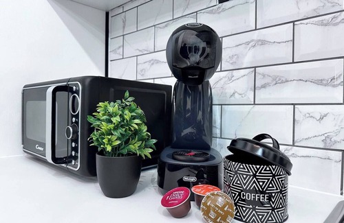 High ceilings create a spacious feel, with Wi-Fi, smart TVs, and a coffee machine for comfort. Features a cozy double bedroom, full kitchen, and sleek bathroom.