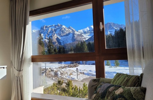 Dining room with extendable table, sofa bed, 50-inch television and panoramic window with spectacular views of the Brenta Dolomites and ski slopes.
