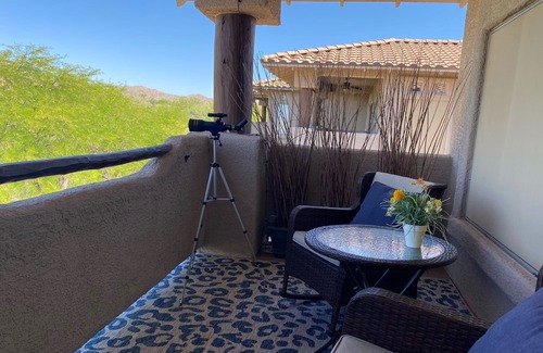 Outstanding second floor end unit with GARAGE, features 2 king bedrooms with 2 en-suite baths. The living room has a Smart TV , sound bar. cozy sofa and 2 swivel chairs, plus an electric fireplace for chilly desert nights. The kitchen has been updated with gorgeous granite and stainless appliances and is fully stocked for those who love to cook..the balcony has an electric grill for the grillers in your family. A west facing quiet balcony overlooks the Vistoso Trails Nature Preserve a refuge for birds, deer, javelina, coyote and bobcat..a family of great horned owls lives on the premises as well. The large heated pool with spa is just a short stroll away... close but just far enough away to keep everything quiet.. The clubhouse has a small exercise room and an office if you are so inclined. There are 5 golf courses within 5 miles and 6 miles of walking/ bike paths right out your door in the recently acquired Vistoso Trails Nature Preserve.