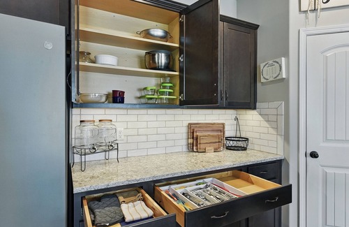 The Space: 6 bedrooms, 3 baths, private pool, movie room, two dining areas, TVs in every room, sleeps 16, stylish modern farmhouse charm.