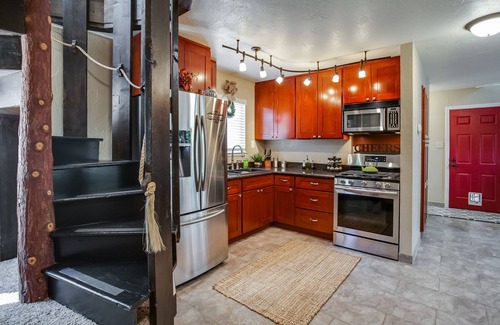 This modern mountain house has a wrap-around deck and an outdoor fire pit area for entertaining. At night enjoy the peaceful ambiance of the trees lit up by outdoor lighting. Entering the home, you will be greeted by floor-to-ceiling windows to showcase the natural beauty that surrounds you. Hardwood floors, tile, and new carpet throughout. Brand new furniture throughout the home. Updated kitchen with granite countertops, stainless steel refrigerator, microwave, and gas oven. Fully stocked kitchen with everything you will need to prepare meals. Keurig with a variety of coffee pods. Three flat-screen TV with access to Roku and Netflix. Large movie library. 2 bedrooms, One bathroom with Shower. The shower has an oversized rainfall showerhead. Spiral staircase to lead you up to the loft/ 2nd bedroom area. Central heating throughout the house and wood-burning stove. There are 5 beds total. The main level bedroom has a bunk bed that features a full bed and 2 twin beds. The loft offers a Queen size bed and a futon that becomes a full bed. All beds have memory foam mattresses to ensure a restful night's sleep. The futon has a featherbed for extra comfort. All beds have bamboo sheets, memory foam pillows, and down comforters.
