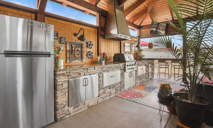 This space sleeps 6 adults comfortably and 2 kids on an air mattress. A well stocked kitchen for all your cooking needs! Outdoor kitchen has refrigerator, BBQ, beer/wine fridge and gas fireplace. Pool can be heated for additional fee in September and April. Pool is closed October - March. Dog must be discussed with owner as we have allergies to shedding dogs.