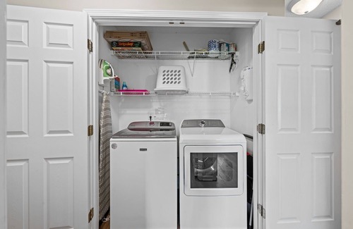 Free on-site washer and dryer. We provide a couple of laundry pods and dryer sheets. Iron and ironing board are located in the laundry area.