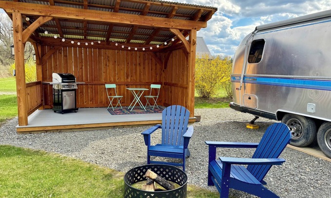 Discover the best of the Finger Lakes from this vintage 25' Airstream! "Cricket Camp" at Hector Meadows features a queen bed, 100% cotton linens, and sweet private outdoor dining and game gazebo and fire pit. Venture out to explore the region's wineries, breweries, local eats, waterfalls, and hiking trails. Or stay close to explore our 15 acres of meadow trails and take a dip in the swimming pond. Relax on-site with lawn games, grilling, and serene views~ this cozy retreat has it all!