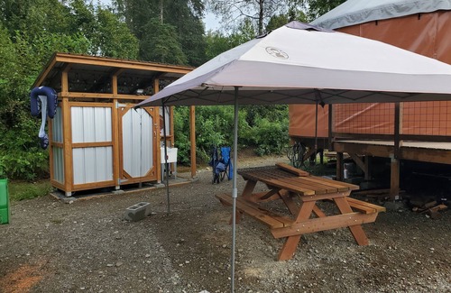 Beautiful 20' yurt (314 sf) located on a quiet Nikiski lake. The yurt, outhouse, and shower house have electricity and are lighted. The yurt also has a ceiling fan and is heated by a Toyo stove to help keep it toasty warm in the winter. There is a nice front deck (Trex), a picnic table (under a canopy in the summer), and interior furnishings are predominantly custom-built log (bed, hutch, table/chairs, and coffee table). There is a small refrigerator, coffee maker, hot water maker, and toaster. There are kayaks, a canoe, and a paddleboard available for summertime use. The lake is indeed swimmable in the summer. There is a nice firepit with firewood provided as well as a Weber charcoal grill. Not far from local Cook Inlet beaches and the Captain Cook recreational site.