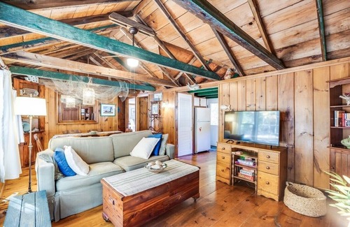 This dog-friendly (with $100 fee per stay), two-bedroom cottage is in the peaceful setting of Cottage Grove Cottage Colony in Eastham. AC window units keep the cottage cool on the hottest of days and a deck backing up to a serene, wooded path is perfect for grilling out on the charcoal grill. With a comfortable queen bed and two twin beds, a full kitchen with everything you need for cooking at home, a living room with a large streaming Roku TV, and plenty of board games for entertainment, you and your family will have plenty of room for relaxing at the end of your adventurous day on the Cape.