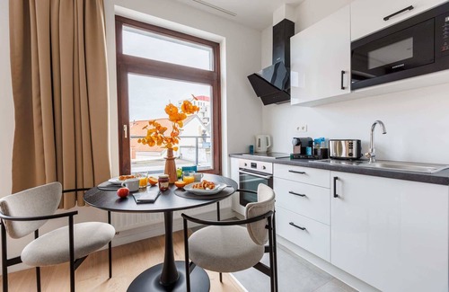 Depending on the selected apartment, you will find either a traditional dining area or a contemporary high dining table with chairs, guaranteeing an enjoyable space for snacks and meals