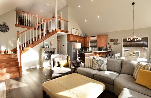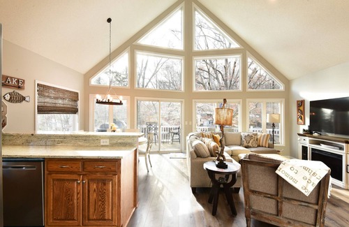 3 bedroom, plus loft, 3 bath home! Lots of light with a wall of windows in the great room, overlooking a wrap around deck with views of the lake. Large finished basement with picture window overlooking the lower level patio. The dock has a full sundeck on the top. Separate two car garage with parking for up to 4 cars. Home is fully fenced/gated in, perfect for families with small children! Bring Your boat! Relax at all 4 firepits! Watch the sunset over a game of darts or cornhole on the patio!