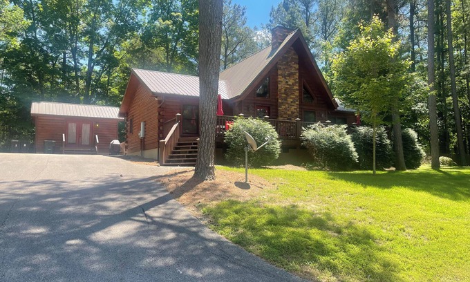 Swiftwater which sleeps 6 is a perfect place to stay whether you are hiking on the one-mile Lake Ridge Trail to explore for birds or Bald Eagle, boating on the 5,000-acre Falls of Rough Lake, or going to the beautiful lodge to dine, or attending one of their many events. The A-frame log cabin is surrounded by oak and pine trees that give lots of privacy to enjoy the peaceful sounds of nature. The cabin has 2 bedrooms with queen beds in each room and a sleeper sofa in the living room. One of the bedrooms has a jetted jacuzzi tub plus a large walk-in shower and the other has a full tub/bath shower. The kitchen and living room are an open concept with a stone fireplace to enjoy on those cool nights and a large screen TV above. The kitchen is equipped with all the amenities you will need to enjoy your stay and we provide a few trash bags, paper towels, dishwashing soap, and sample coffee for your arrival. A full-size washer and dryer is available with detergent if needed. A gas grill is located outside for barbecuing with grilling utensils inside the kitchen. Behind the cabin is a fire pit and seating to enjoy at night to roast hotdogs or smores with your friends or family. The front deck has two dining tables with umbrellas and seating for eight to enjoy late afternoon views of the lake while relaxing or dining. There is a neighborhood pond to fish for catch and release for enjoyment. We have a TV in each bedroom and living room with Roku remotes and free Wi-Fi.