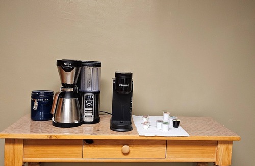 KITCHEN: Fully equipped with all the cooking basics including spices and cooking oils. Coffee/tea bar with Keurig single-serve coffee maker and Ninja drip coffee maker. Microwave, toaster, blender, dishware/flatware.