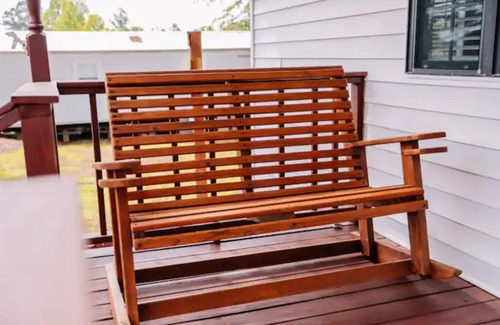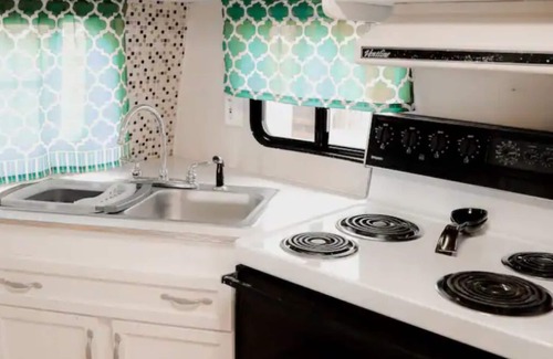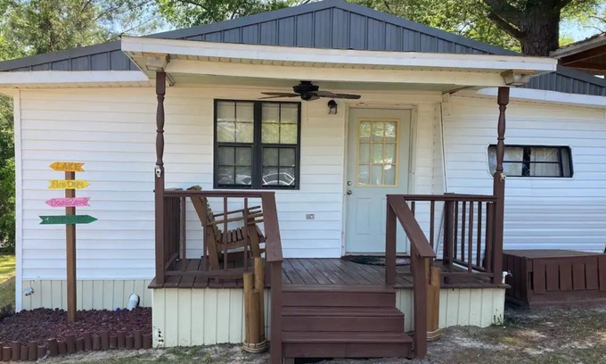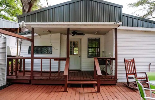 Enjoy the entire property covering more than +/- 600 square feet of complete relaxation. It is a creative solution for glamping. The main bedroom and kitchen utilized a 32-foot bumper pull camper and were modernized to add a living room, dining room, full bathroom, and two decks to have a fully functional weekend retreat. There is a queen-sized bed and 2 twin XL roll-out beds to sleep 4. Wi-Fi, TV, AC, pots/pans, and parking included.