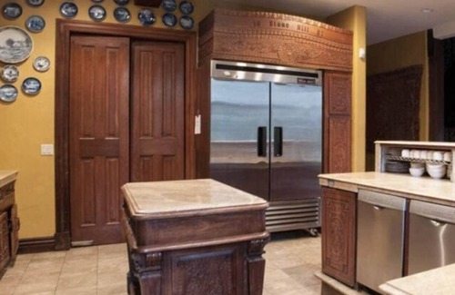 The round table dining room has a large custom table that seats 11-15 guests and has a painted panoramic mural. The long table dining room has a long hand-carved wooden table that seats 10. It also has an automatic gas-burning fireplace, leather couch, mountain views and a grand piano. Enjoy the fully stocked kitchen with extra-large industrial refrigerator, stand-up freezer, ample pantry space, two Bosch dishwashers, two Wolff ovens, 6 burner stove, large built-in griddle, marble countertops, coffee maker, microwave, rice cooker, toaster, and dining flatware for about 20. The family room has couches and armchairs, seating good for about 20 guests. There's also a high chair and Pack N Play for your little one. There’s also a drop-down projector screen, DVD/blue-ray player and automatic gas fireplace. There is a large automatic screen and projector in main room for watching movies. There are room air conditioners in bedrooms if needed. The owners had lived in the home for 20 years and have never used them. There's a washer, dryer, iron/ironing board, and hair dryer. For your safety, there's a fire extinguisher, smoke detectors, and carbon monoxide detectors.
