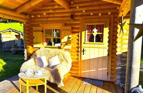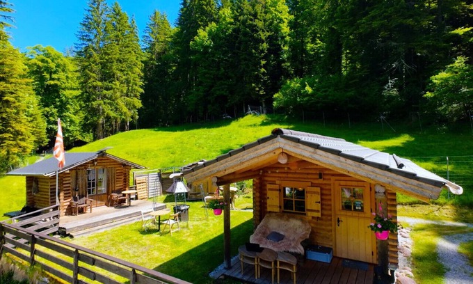 Authentic Swiss Wood Cabin with a double bed for 2 guests, a separate small cabin with a bunk bed for up to 2 children (no adults), and 1 free parking place.