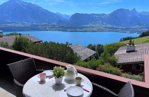 🌅 Balcony with stunning views of Lake Thun and the Alps