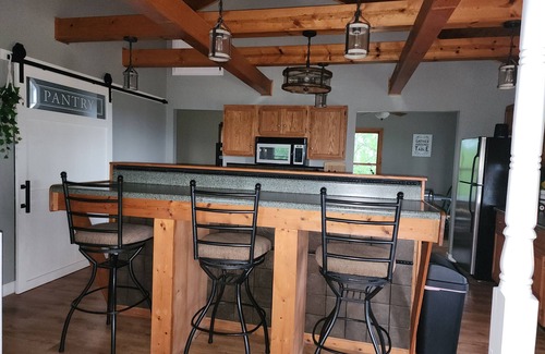 The large cozy kitchen is fully equipped with all your cooking needs, including full size fridge, dishwasher, microwave , and stove. It has a beautiful island with seating and is adjacent to the dining area that has a custom table for family dinners. There is also a table off the living room that allows seating for 4 more guests.