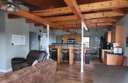 The living room is open concept off of the kitchen with beautiful beamed ceilings and is surrounded by windows allowing for light to fill the home and offer beautiful views while talking about your adventurous day or playing board games with the kids. The living room offers a couch, loveseat and 2 person recliner for watching movies or your favorite shows on the TV provided. Board and card games are provided for your enjoyment. It also allows access out onto the deck for a full view of the property and mountain scenery.