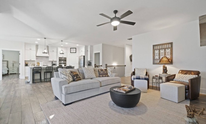 This newly built home is inside Big Canoe just minutes from the main gate. The main floor includes a large master bedroom with ensuite bathroom, a spacious living room with a stone gas fireplace, and one additional bedroom with another ensuite, private bathroom. Superbly designed kitchen includes quartz countertops and LVP flooring throughout the main floor living spaces. The dining room area which is open to the kitchen provides easy access to a beautiful covered back deck which also includes a stacked gas fireplace. The terrace level encompasses an abundant entertainment space with large screen TV, and wrap around couch. This level provides 2 bedrooms with 1 queen bed each, and 1 large bedroom which includes 2 twin beds and a pull out queen bed couch. Outside on the terrace level is a large hot tub for family and friends to enjoy.