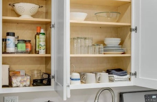 Our fully appointed Kitchen offers a full-sized refrigerator, gas range, Keurig coffee-maker and microwave. The Dining area has table and chairs for four, expandable to six.