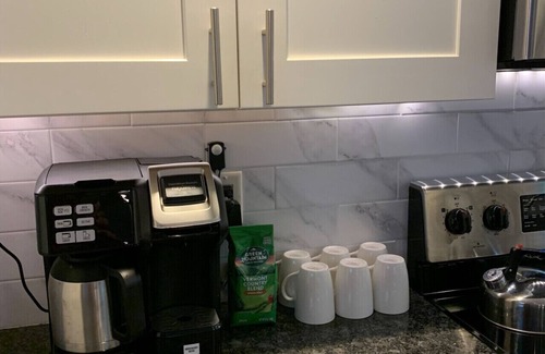 🍽 The kitchen is a chef`s delight and offers an incredible amount of granite counter space with a wrap-around `L` configuration that includes a built-in four-top electric range and stove facing into the great room. A deep stainless sink looks out into the forest through a large window. The large granite island comfortably seats 5 and nestles well into the kitchen providing excellent counterspace for more than one person to cook together. The kitchen is loaded with wonderful white pantries and is appointed with a beautiful white marble backsplash. The fridge is oversized and will be empty for you fill as you like and includes a bottom drawer freezer. Additional appliances include a dishwasher, large microwave, toaster, and a coffee maker that can be used with k-cups or to make a full pot when you need a little extra.