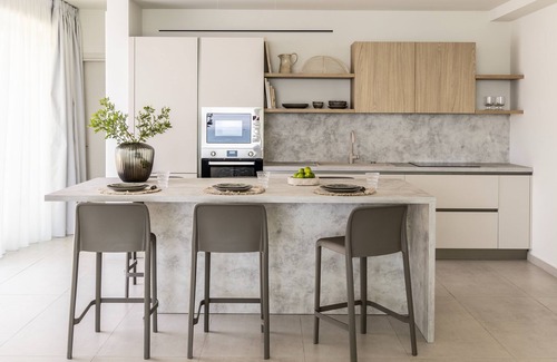 The villa features three spacious bedrooms with comfortable beds and natural light, three sleek bathrooms, and a guest WC. The open-plan living room connects seamlessly with a stylish, fully equipped kitchen, creating the perfect space for cooking, lounging, or spending time together.