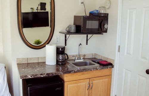 1 Queen Bed, 1 Pull Down Couch, Rocking Chair, shower with separate bathtub, kitchenette, microwave, coffee maker, mini fridge, flat screen TV, Direct TV, deck with patio furniture.