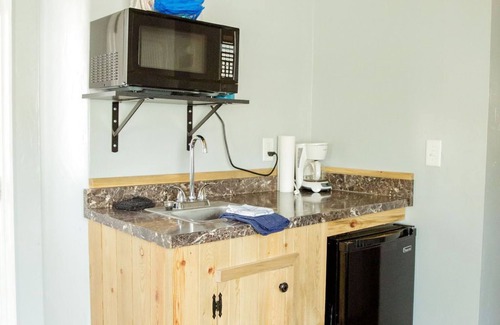 1 Queen Bed,1 Fold Down Couch, Kitchenette, Microwave, coffee maker, mini fridge, flat screen TV, Direct TV, deck with patio furniture.