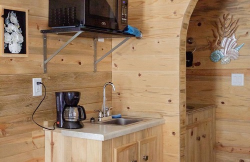 1 queen bed, 1 fold down couch, kitchenette, microwave, coffee maker, mini fridge, flat screen TV, Direct TV, deck with patio furniture.