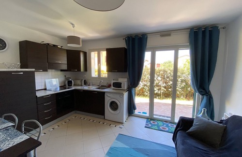 Apartment type 2 in ground garden, consisting of an entrance, air-conditioned living room with terrace, fully equipped open kitchen, a bedroom and a bathroom with toilet. Washing machine, hair dryer, television, wifi