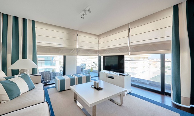90 m2 (970 ft2) - the apartment has 2 bedrooms. The master bedroom is equipped with a new king size bed and has ensuite bathroom equipped with a bath tub. The second bedroom has a queen size bed. The second bathroom has a walk-in shower. The 24m2 of balconies have direct views of Ria and 2 minutes from the beach.