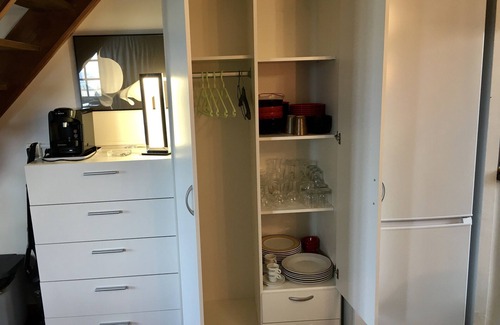 A secure staircase takes you to the mezzanine or a comfortable 140 cm bed awaits you surrounded by cupboards.