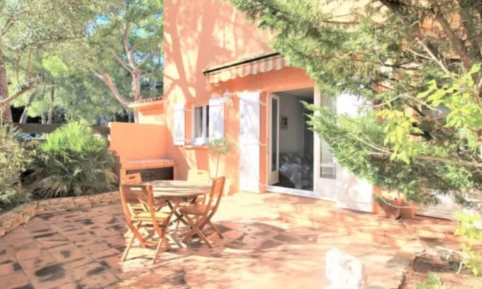 La Madrague 2 km from Saint Cyr Sur Mer: Residence Mas de la Madrague, surrounded by trees. At the top of the resort of La Madrague, quiet, elevated position on a hill, 300 m from the sea, direct access on foot: sandy beach 500 m, pebble beach 300 m. Supermarket 2.5 km, restaurant 400 m. Golf course (18 holes) 3.5 km.