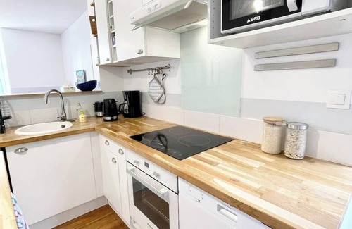 The flat has a washing machine, dishwasher, conventional oven and microwave, conventional coffee maker, toaster, fridge, kettle and induction hob.