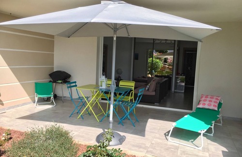 The 60 m2 east-west apartment is located on the ground floor of a small new residence of 8 apartments, 800m from the beach.