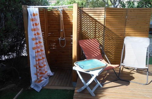Newly built wooden terrace shaded at noon by a large pine, furniture, deckchairs, outdoor sink and shower are fed hot water, charcoal and electric barbecues